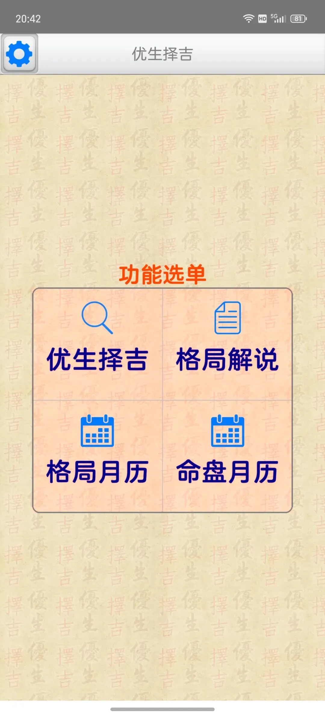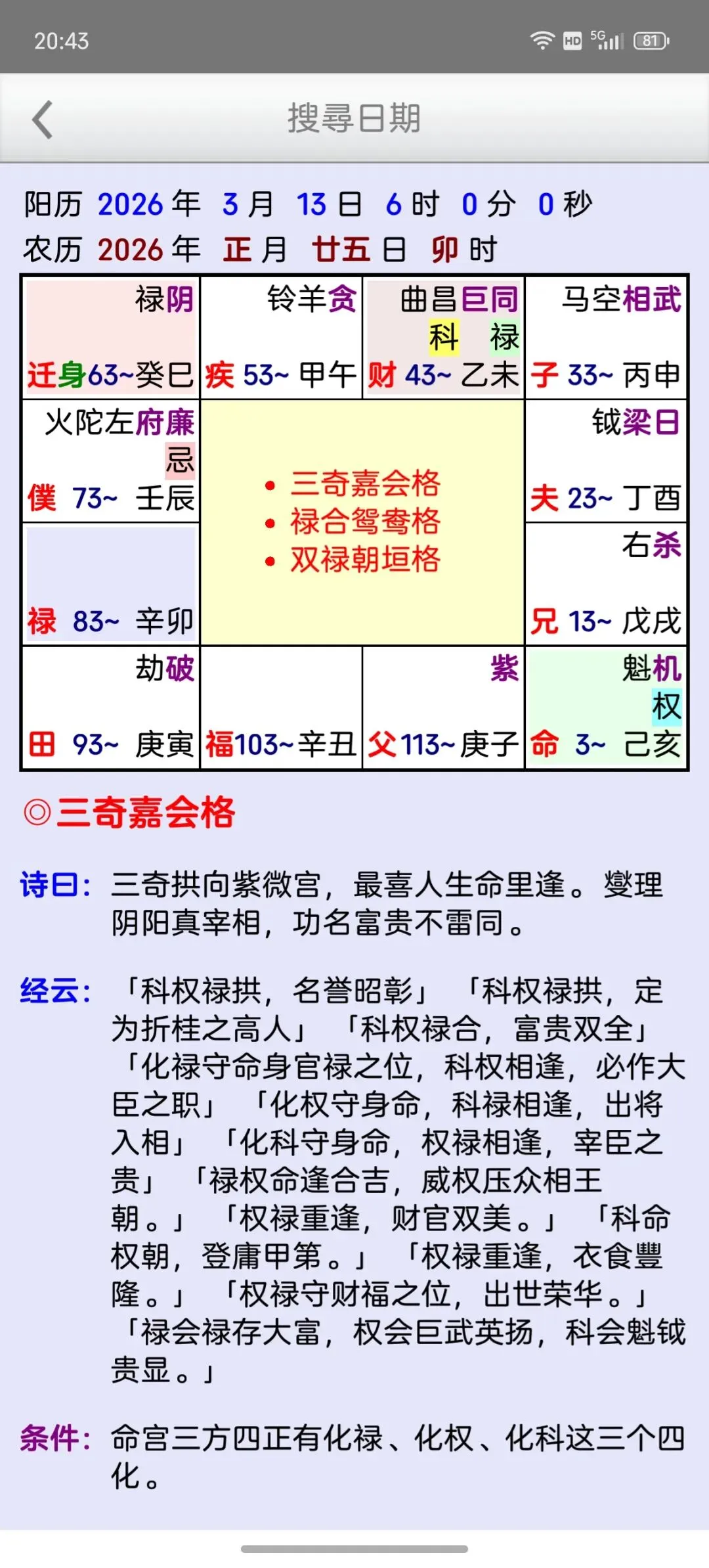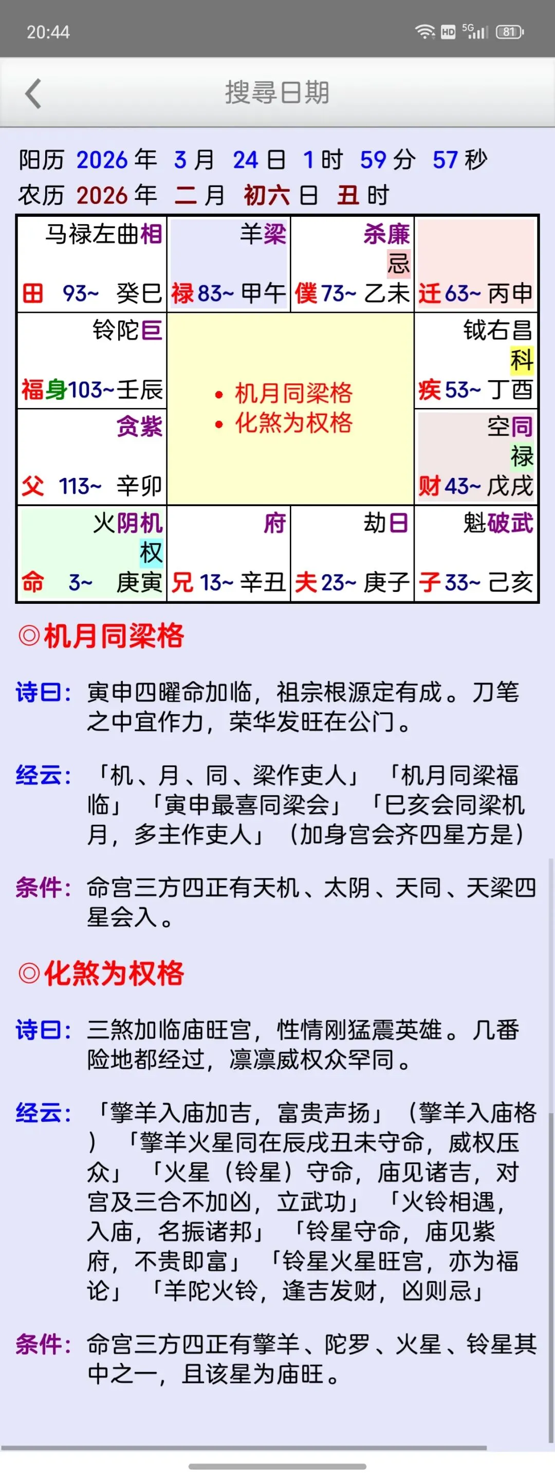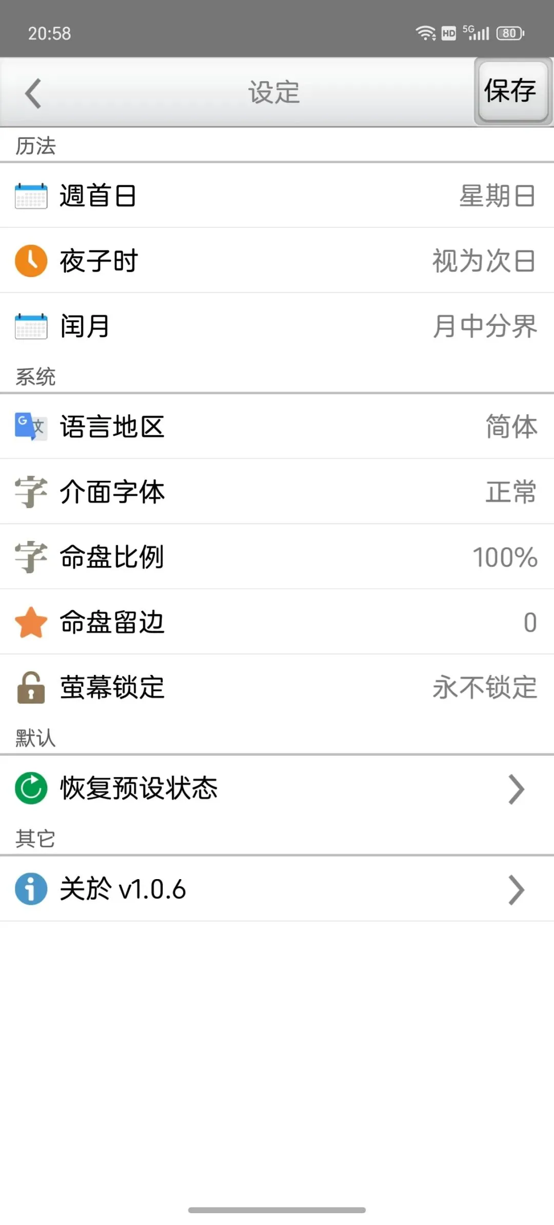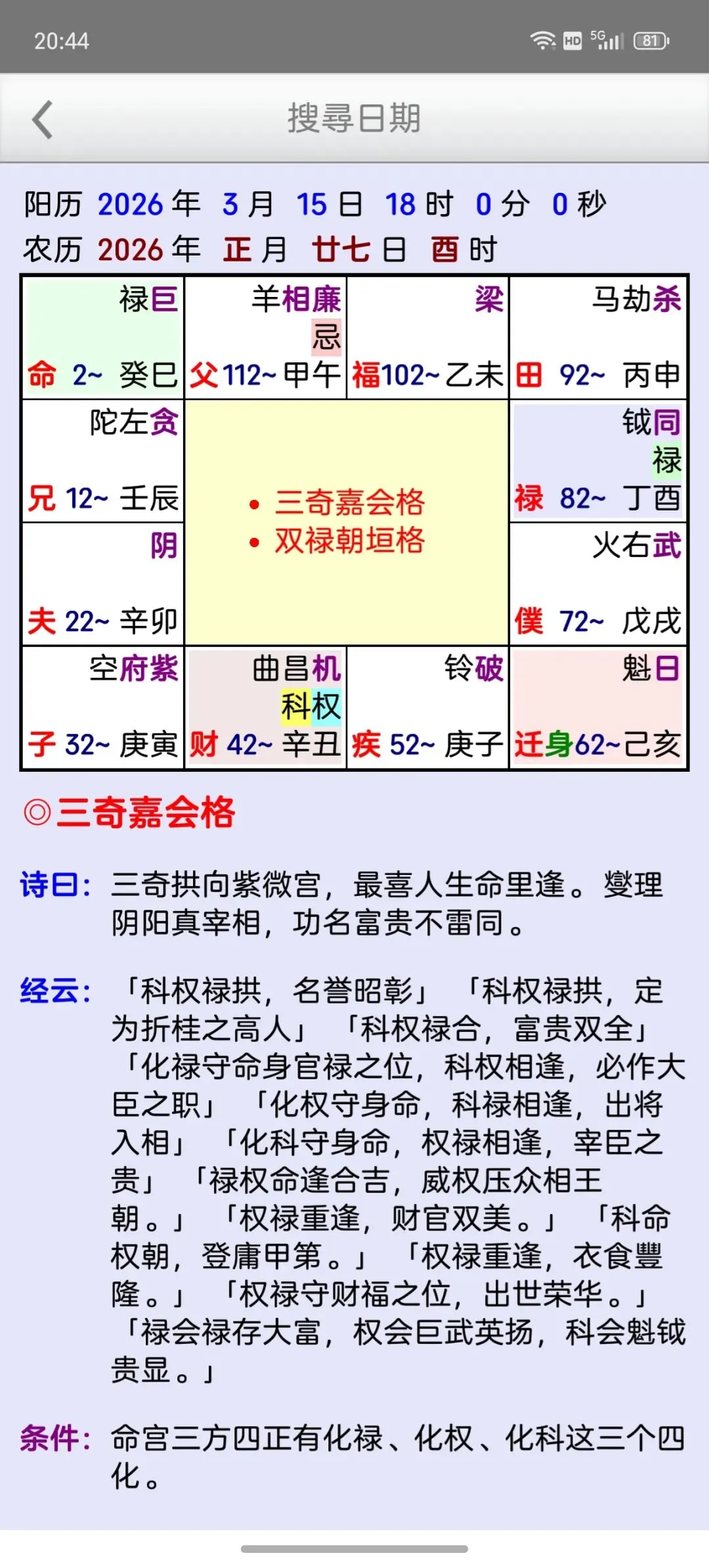 这是一个能在一个日期范围内,快速的找到最佳的剖复生产日期(优生择吉)筛选工具,它可以在每一天的每一个时辰,依指定条件,来搜寻想要的格局组合,更多功能如下:优生择吉:指定起始日期~结束日期之范围,并可选择下列搜寻条件:选取搜寻符合紫微「57 个吉格局」(可复选)选取搜寻排除紫微「37 个凶格局」(可复选)吉格局条件,可选择「勾选全部符合」或「勾选任一符合」搜寻到的日期列表内,会提示日期符合的项目。月历命盘格局:月历:可上下滑动来调整月份。提供直接输入「阳历、农历、干支」来显示内容。提供快速调整日期「加/减月,加/减日,加/减时」功能。显示内容包括:紫微命盘、格局古文解说、格局成立条件。偏好设定:週首日:设定一週开始的星期。历法:提供夜子时、闰月等设定。语言地区:可随时切换介面语言,提供繁体中文、简体中文。介面字型:提供字型大小调整。萤幕锁定:不锁定可长时间使用,萤幕不会关闭。★ 万年历提供:西元 1600 ~ 2200 年。★ 操作介面:繁体中文、简体中文。★ 同时支援平板大萤幕任意方向显示。
