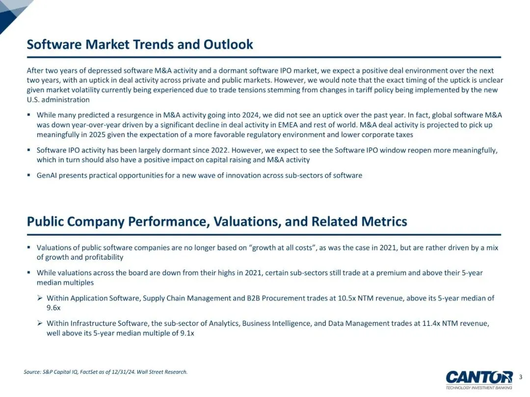 报告回顾2024年全球软件与SaaS板块在估值、IPO、并购及私募市场的表现,并给出2025-2026年展望:宏观利率见顶、监管趋松、GenAI落地三大因素叠加,预计交易活跃度与估值中枢均温和回升,但“增长+盈利”并重的新估值框架不变;软件并购交易数量已连降两年,2024年仅1,962起(同比-19%),但2025年有望重回2,300起以上;IPO窗口仅向Rule of 40≥40%且收入≥5亿美元的高质量公司敞开,2024年五家美股软件IPO首日至今中位涨幅44.9%,显著跑赢大盘。