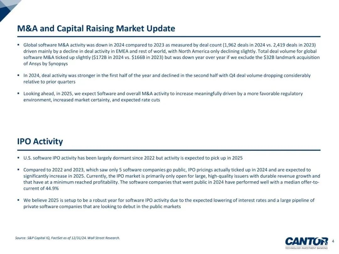 1) 全球并购:2024年软件并购1,962起、总交易1,720亿美元(含Synopsys 320亿美元 mega-deal),起数同比-19%,金额+4%;Q4单季交易量51亿美元,为五年低点。