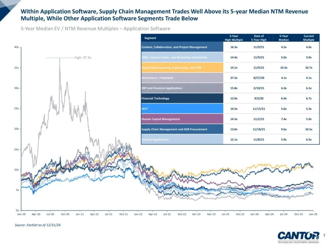 2) 子板块分化:供应链与B2B采购、数字制造仍享溢价——NTM收入倍数10.5×、10.7×,分别高出5年均值9%、4%;而云通信、电商支付仅1.8×、2.3×,低于历史中枢30%以上。