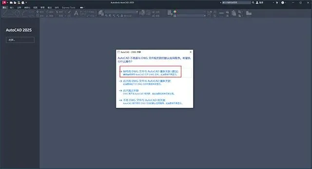 8、进入软件开始界面,弹出AutodCAD- DWG关联窗口,选择第一个选项点击,软件界面如下(如果没有出现则跳过这一步):
