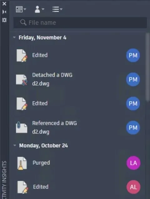只要在 AutoCAD 中打开并处理图形文件时,“活动见解”功能就会跟踪事件。它还可以跟踪 AutoCAD 之外的一些事件,例如在“Windows 资源管理器”中重命名或复制图形。打开图形时,将从“活动见解”数据库中读取在图形中执行的过去事件,并将这些事件按时间顺序显示在“活动见解”选项板中。同时,当您处理图形时,事件会写入数据库,这将使选项板的内容保持最新。