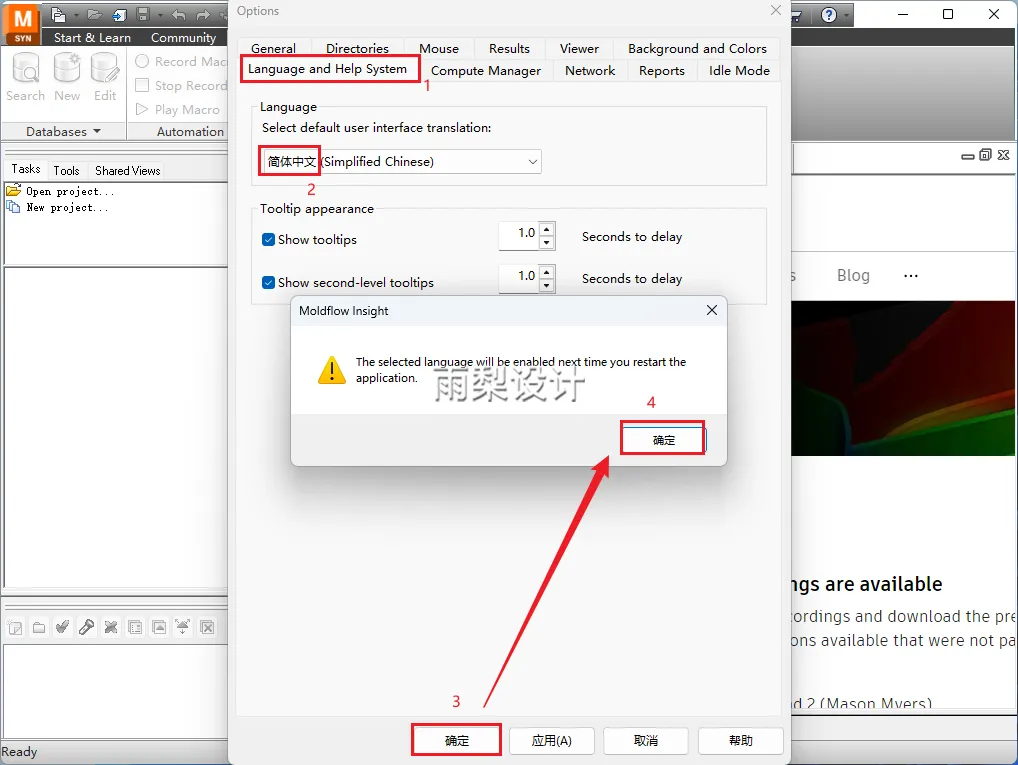 18.①点击【Language and Help System】,②选择【简体中文】,③点击【确定】,④点击【确定】