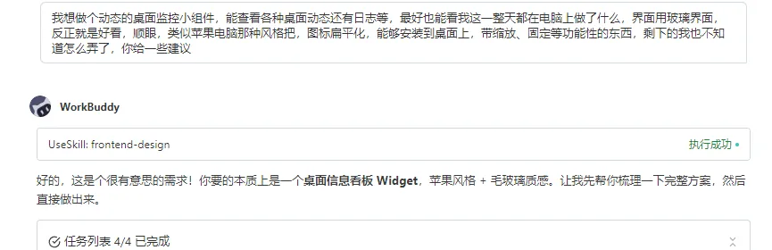 我的需求说得很乱:要有苹果电脑那种质感,能看系统状态,能看今天干了什么,图标扁平,能拖动能缩放能固定。