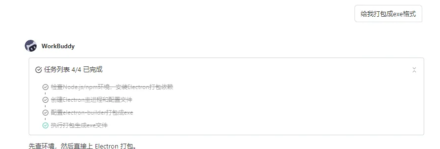第一次打包失败,没有报错,就安静地失败了。OpenClaw 排查后发现是 electron-builder 的日志被 shell 吃掉了,换了个带日志的自定义构建脚本,配上国内镜像,第二次就成了。