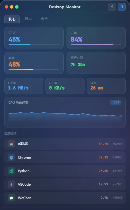 用的是 glassmorphism(玻璃拟态)风格,深色底,模糊磨砂效果,CPU、内存、网络实时数据全有,左边一栏活动日志,按时间线排今天做了什么。右下角四个小按钮:置顶、固定、透明度调节、最小化。