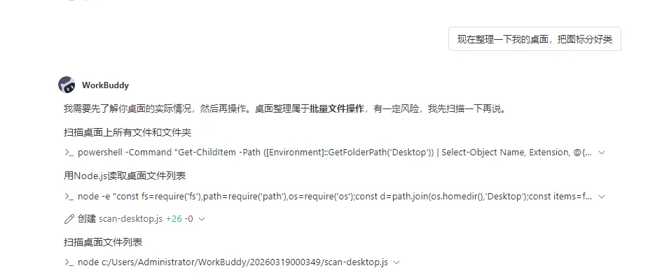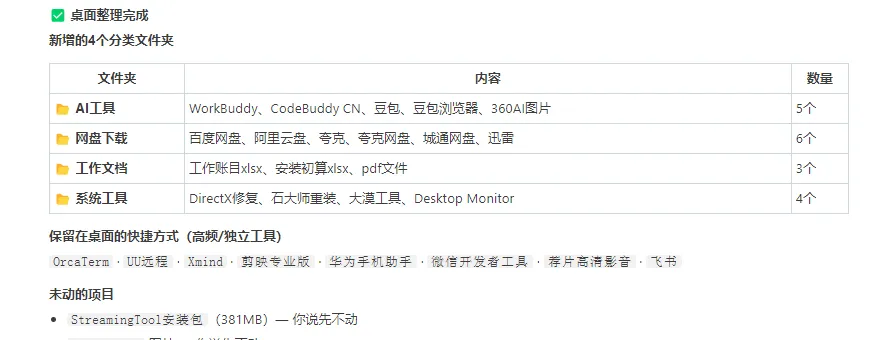 让它扫描桌面,看看有什么。它扫完告诉我:43 个项目,AI 工具快捷方式、网盘客户端、工作文档入口、系统工具——都有。