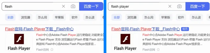 3.另外,有时搜索的关键字不当也会搜不到带官方标志的连接,此时可更换关键字再试。例如下图为两个不同关键字的搜索对比,结果是一样的,但右侧的才有官方标志。