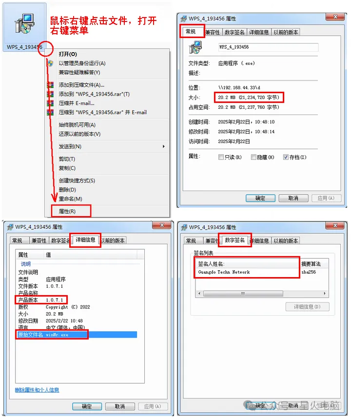 然后,还要调查文件的属性。例如打开上图右边文件的属性,该文件只有20MB大小,WPS安装包绝不可能这么小!另外在详细信息中版本等信息也与WPS完全不搭边,最后在数字签名中看到的开发商也不是WPS的。所以该安装包是假的,应果断删除,另行寻找!