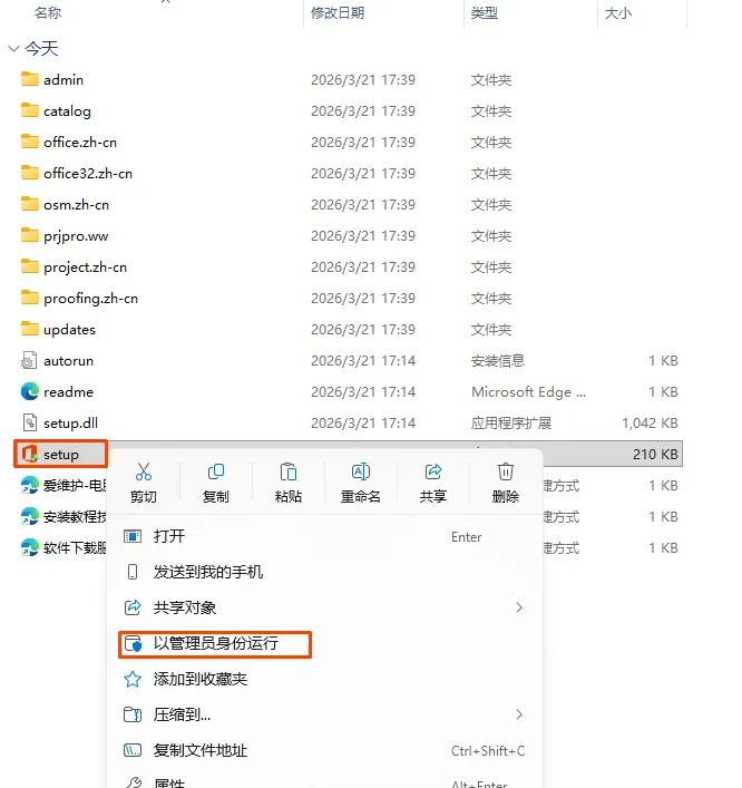 3.解压后,找到文件夹中的setup文件,右键以管理员身份运行安装 |