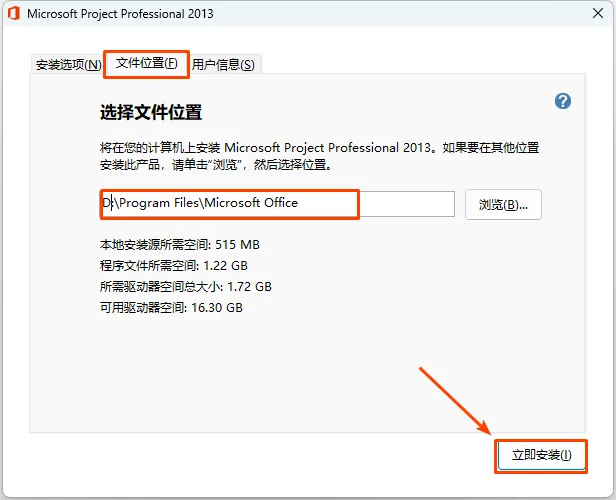 6.点击文件位置页,直接将C修改为你要安装的盘,我们安装到D盘,点击立即安装。 |
