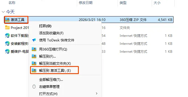9.返回解压后的安装包,找到激活工具。右击选择解压到激活工具,注意!解压前请关闭电脑杀毒软件和防火墙 |