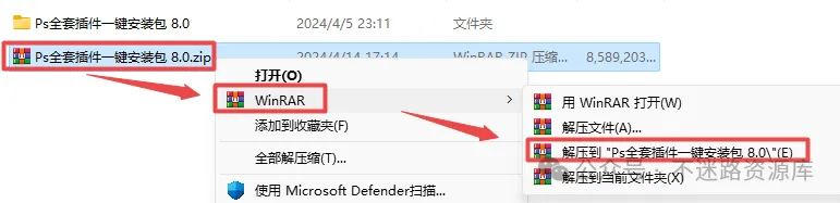 1.选中下载的压缩包,然后鼠标右键选择解压到"Ps全套插件一键安装包 8.0"(没有解压选项点这里)
