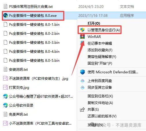 2.打开刚刚解压的文件夹,选中“Ps全套插件一键安装包 8.0.exe”,鼠标右键选择"以管理员身份运行"