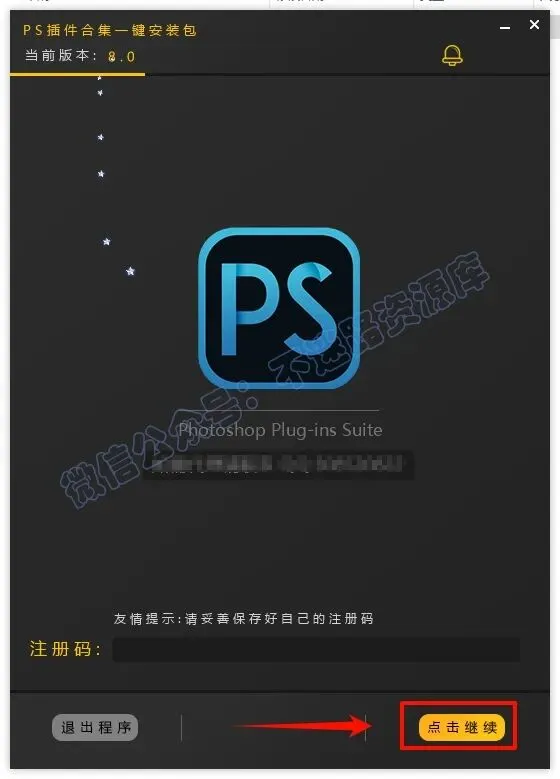 3.插件合集已和谐,安装无需填写注册码,直接点击“点击继续”
