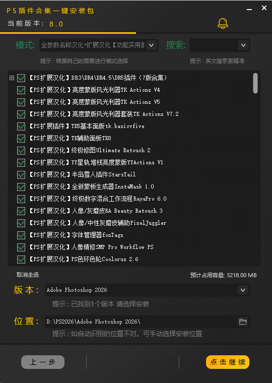 4.根据需要选择安装自己需要的插件,上面还有多种模式可以选择(建议选择一些自己需要的插件即可,装太多没用的插件的话,可能会导致卡顿),软件能自动识别Ps软件版本和安装位置,若电脑上有多个Ps软件版本,请选择需要安装插件的版本,若只有一个Ps软件版本,无需选择;点击“点击继续”