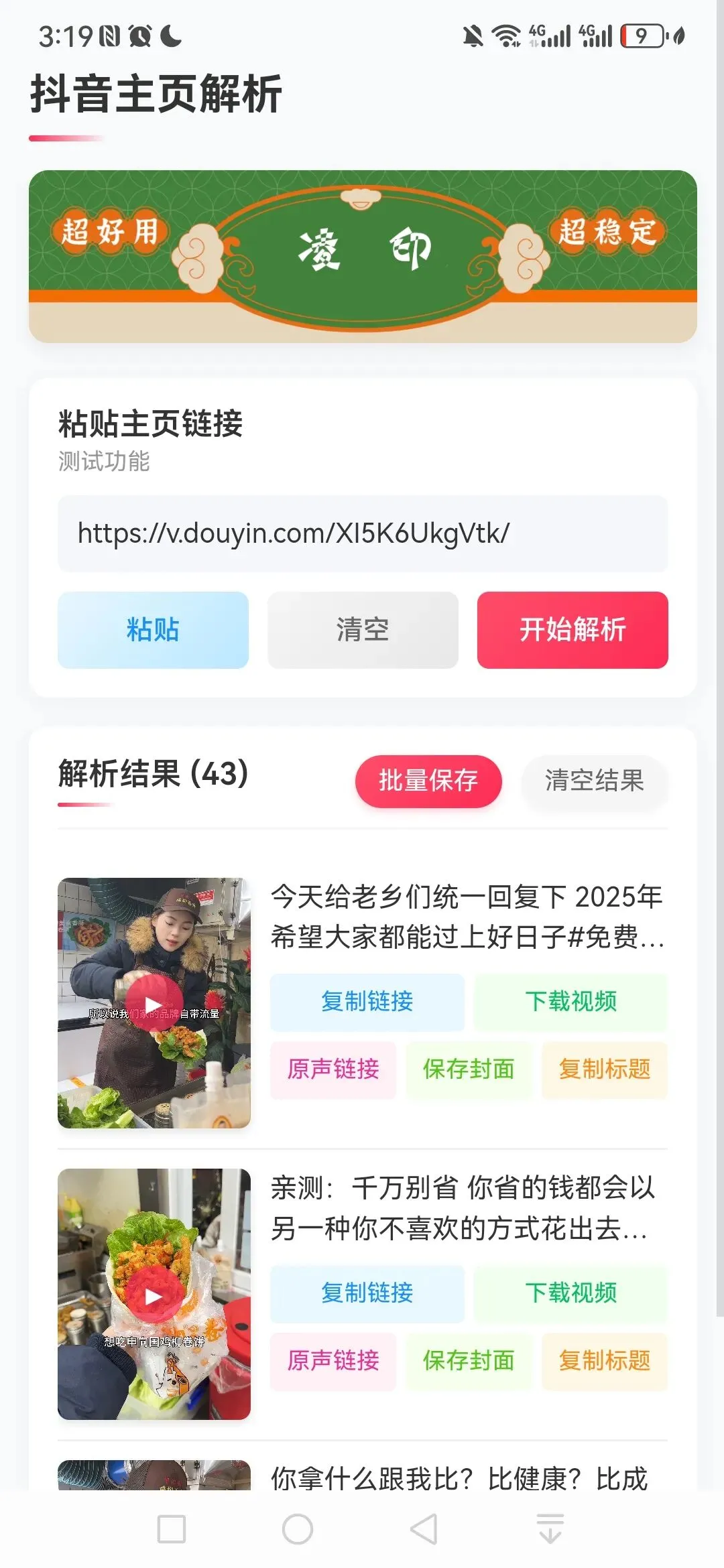 最让我惊喜的是抖音主页批量下载。以前一条一条复制链接,费时费力。现在直接输入主页链接,一次下载50条,效率提升几十倍!做素材收集的朋友一定要试试。