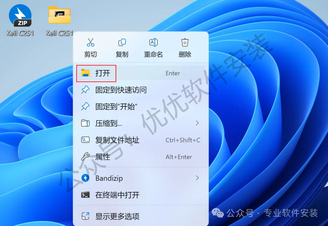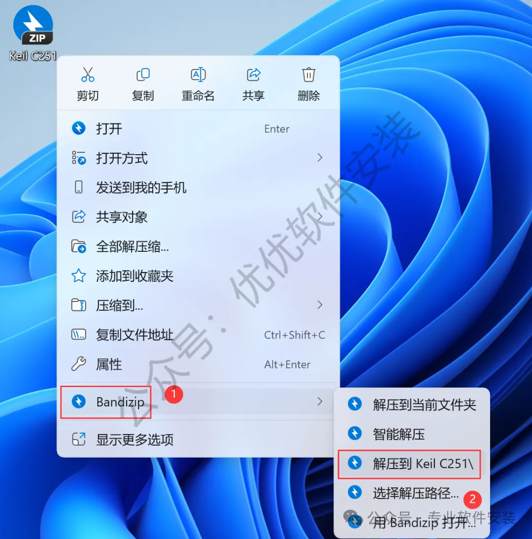 1、下载Keil C251版软件安装包到电脑上,右键选择【解压到Keil C251版\】