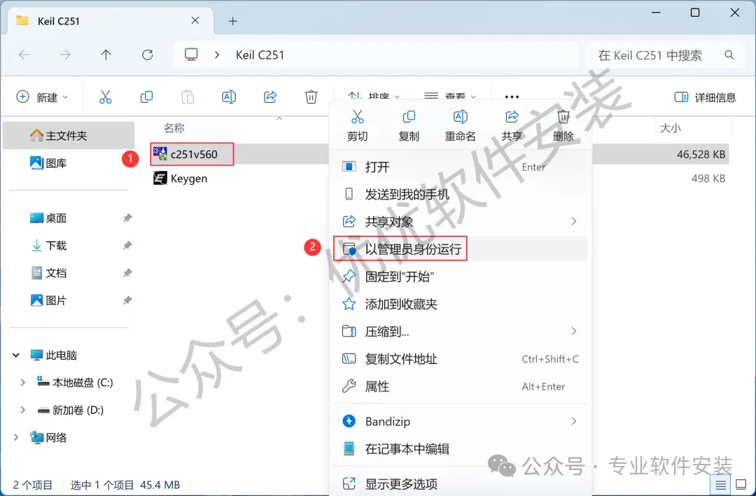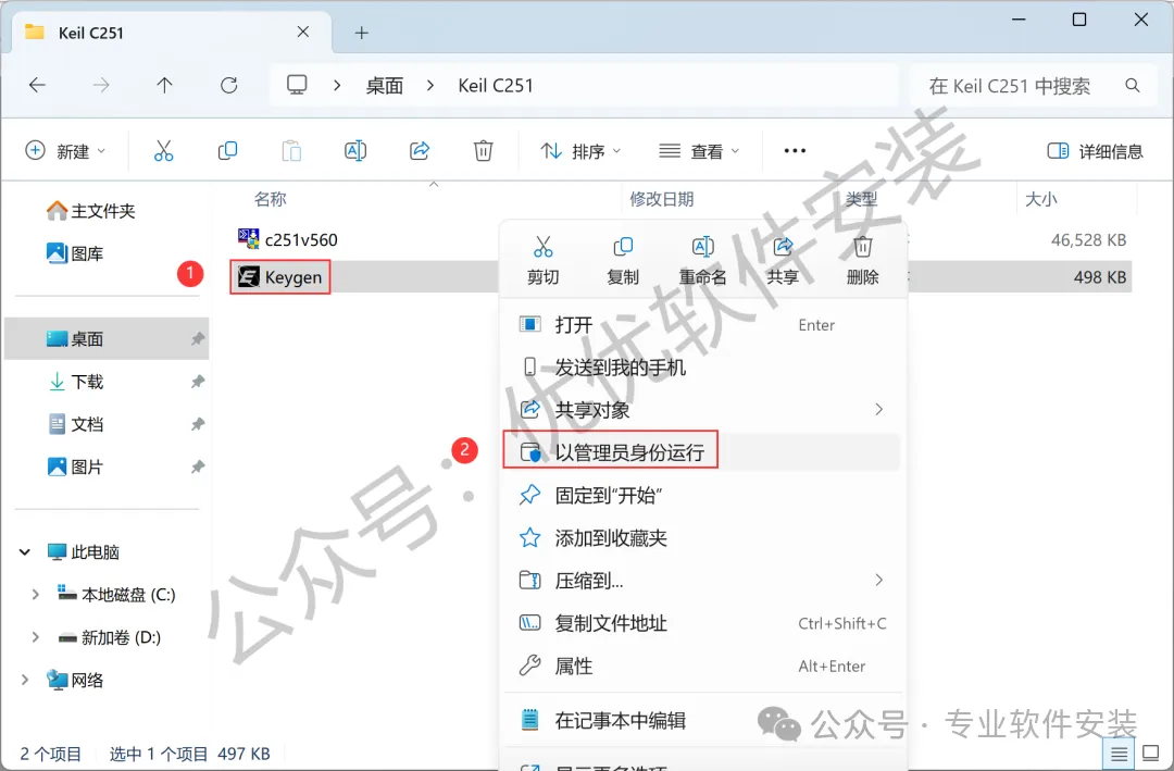 13、回到Keil C251版文件夹,找到【Keygen】应用程序,右键选择【以管理员身份运行】它