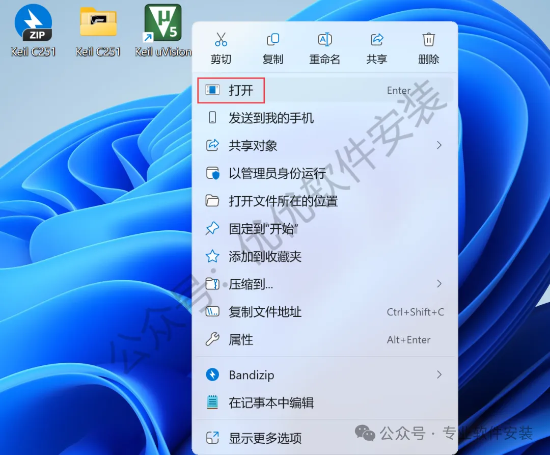 10、回到桌面,右键桌面上的【Keil uVision5软件图标】,点击【打开】