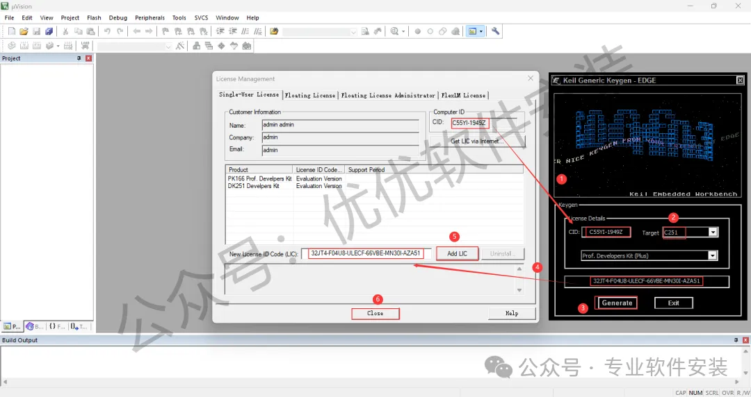 14、回到Keil C251版软件界面,将软件的CID码,输入到Crack程序的CID内,Target选择【C251】,点击【Generate】,将Crack程序获取到的激活码,粘贴到软件的New License ID Code内,点击【Add LIC】,再点击【Close】