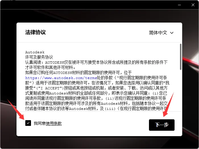3、勾选我同意使用条款,点击下一步。
