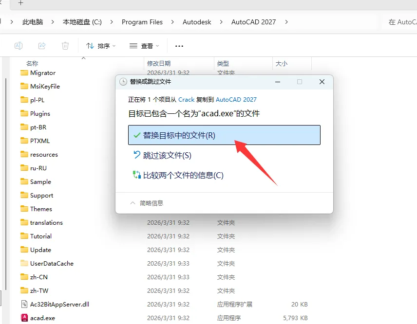 10、在安装路径下粘贴前面复制的acad.exe文件,选择替换目标中的文件。