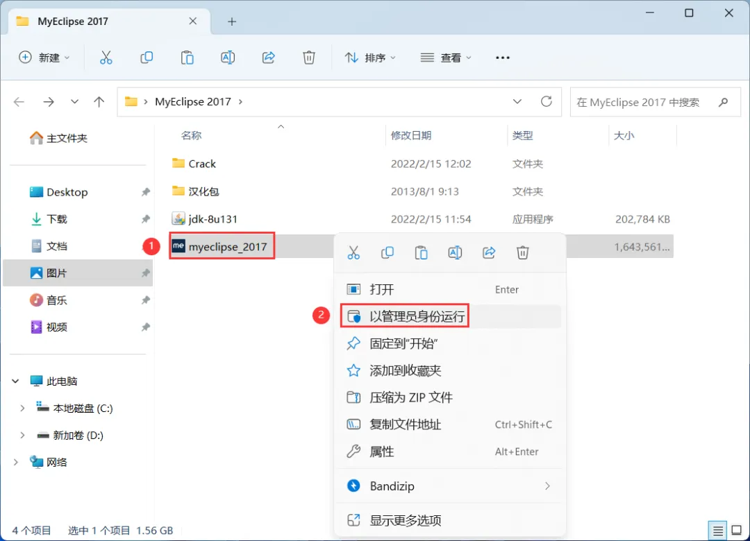 10、回到MyEclipse 2017文件夹,找到【myEclipse_2017】应用程序,右键选择【以管理员身份运行】它