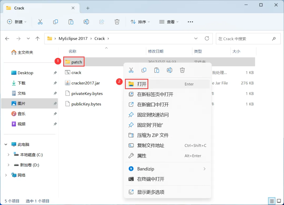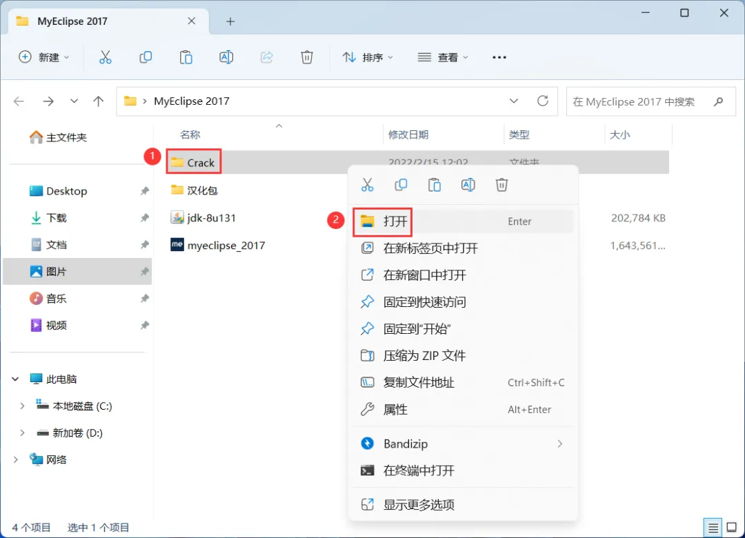 20、回到MyEclipse 2017文件夹,找到【Crack】文件夹,右键【打开】它
