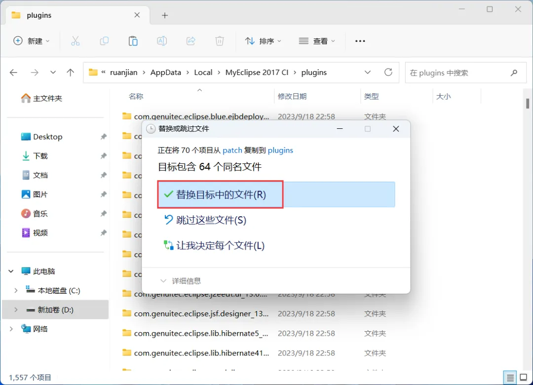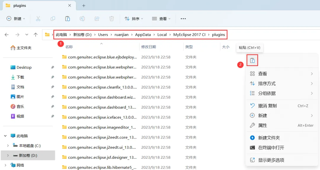 23、打开路径:D:\Users\ruanjian\AppData\Local\MyEclipse CI\plugins,右键文件夹的空白处,点击【粘贴按钮】