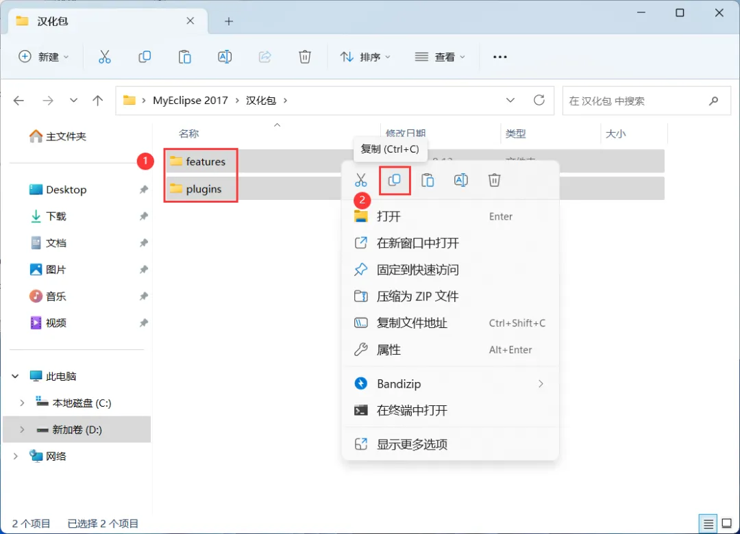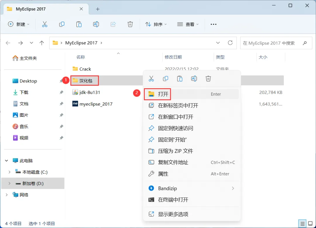 29、回到MyEclipse 2017文件夹,找到【汉化包】文件夹,右键【打开】它