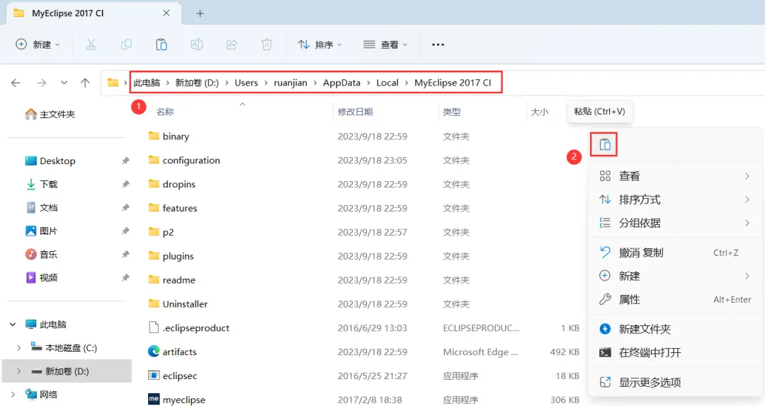 31、打开路径:D:\Users\ruanjian\AppData\Local\MyEclipse 2017 CI,右键文件夹的空白处,点击【粘贴按钮】