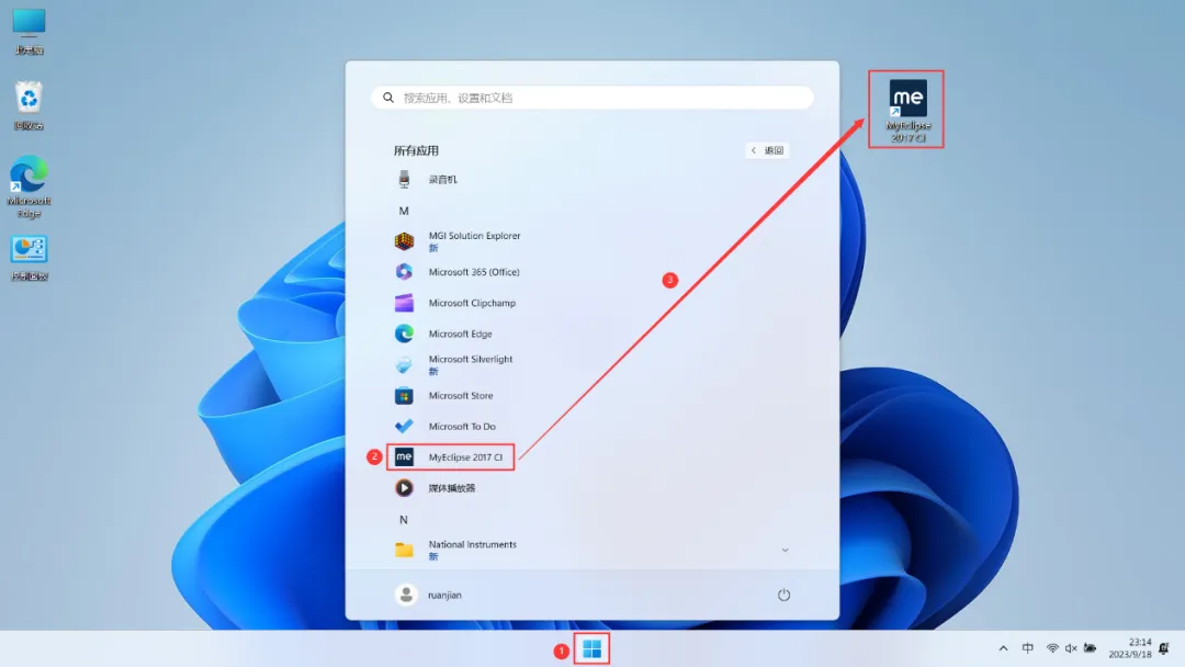 32、回到桌面,点击任务栏的【开始菜单】,在【所有应用】中找到【MyEclipse 2017 CI软件图标】,将软件图标拖到桌面上,完成软件桌面快捷方式的创建