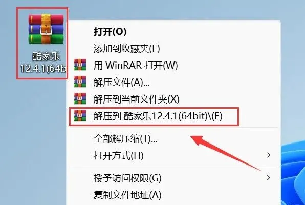 1.解压安装包:鼠标右击【酷家乐12.4.1(64bit)】压缩包,选择电脑上安装的解压软件,点击【解压到酷家乐12.4.1(64bit)】。