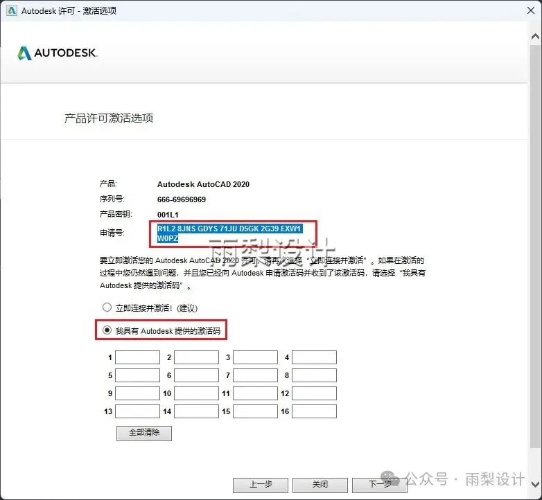 18.复制【申请号】;并且选择【我具有Autodesk提供的激活码】